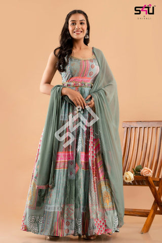 2-3 Days Delivery! Dresses For Women Party Wear Gown Kurtis Suit Chinon with Kodi & Embroidery Sequence Lace Work Green Color, Listing ID: 8920085070106