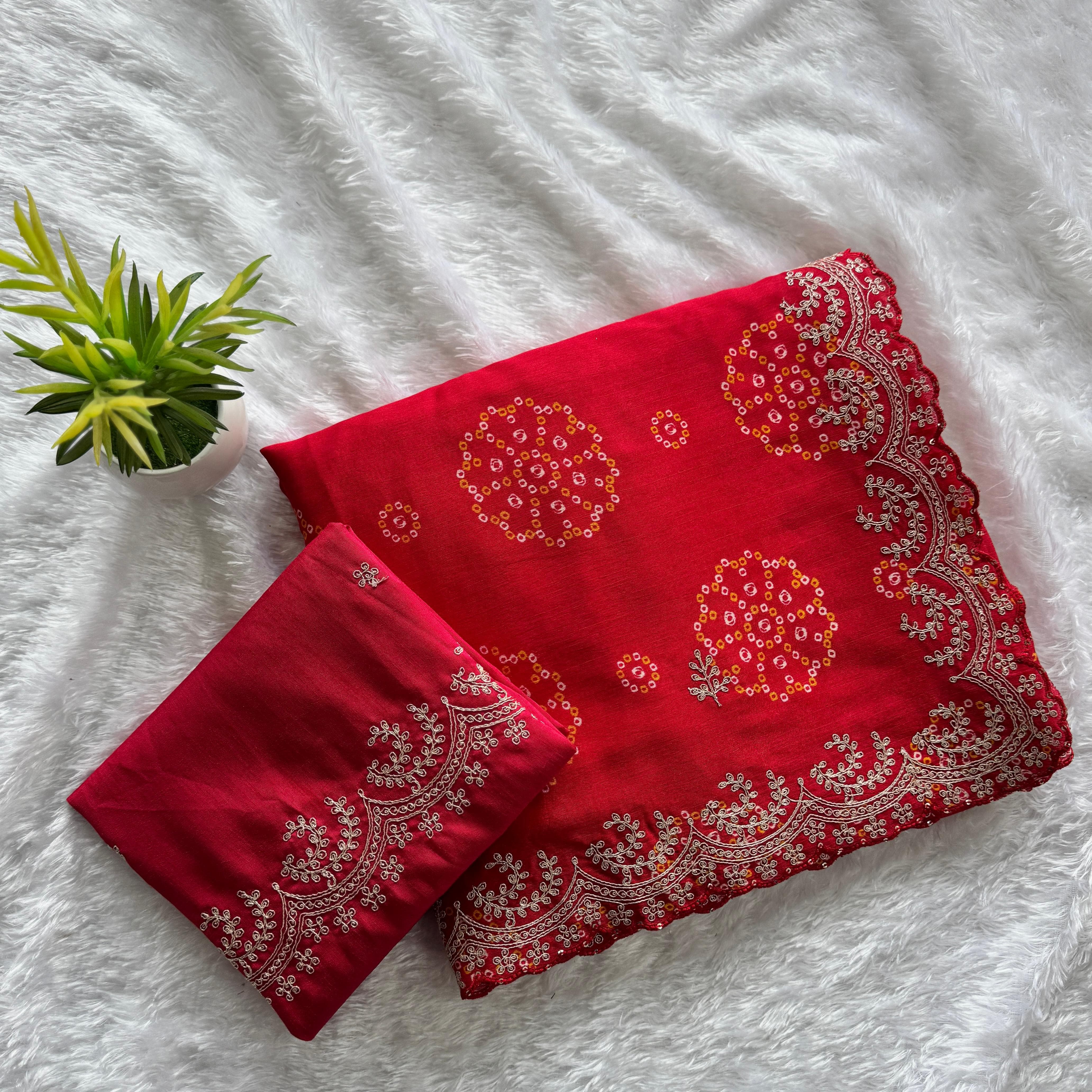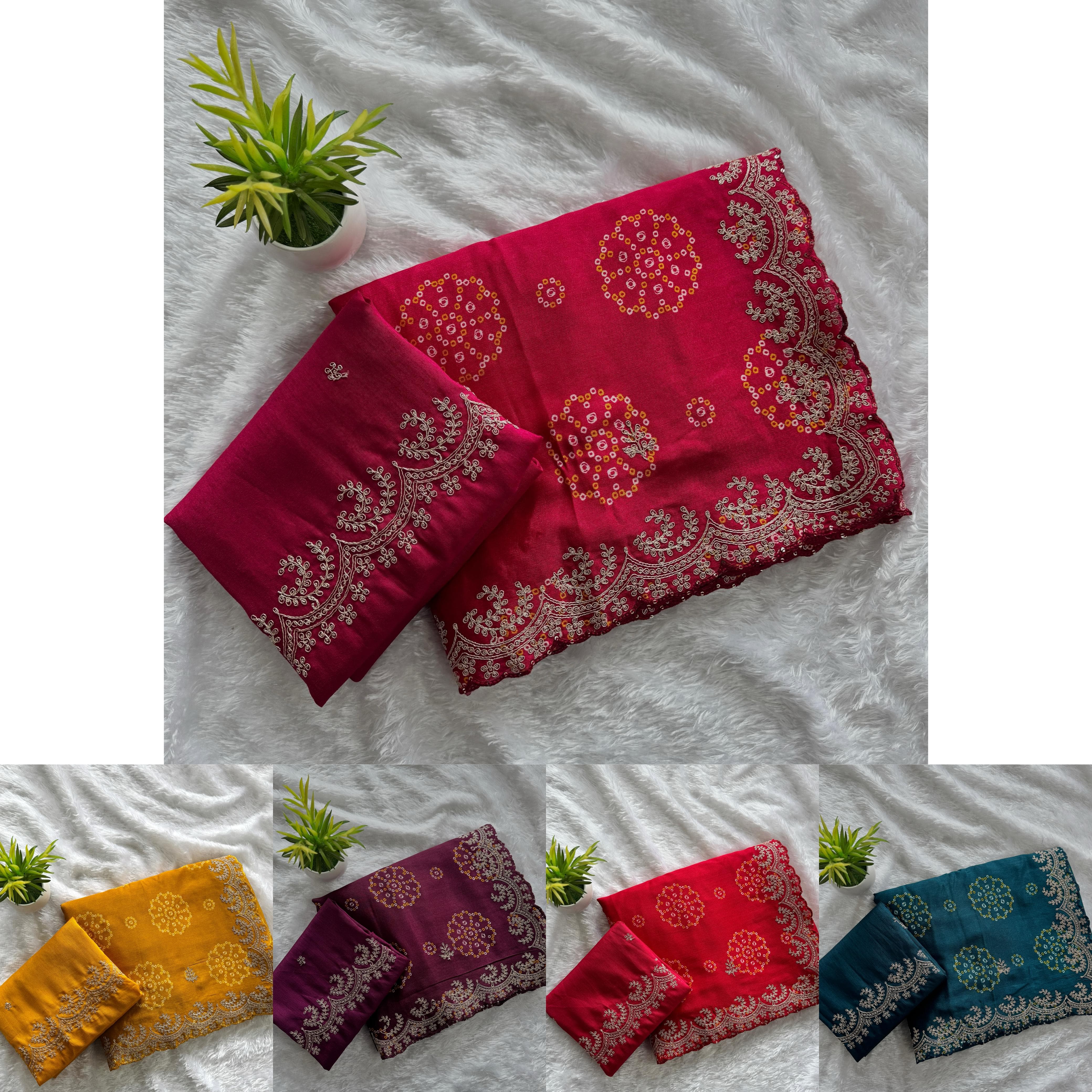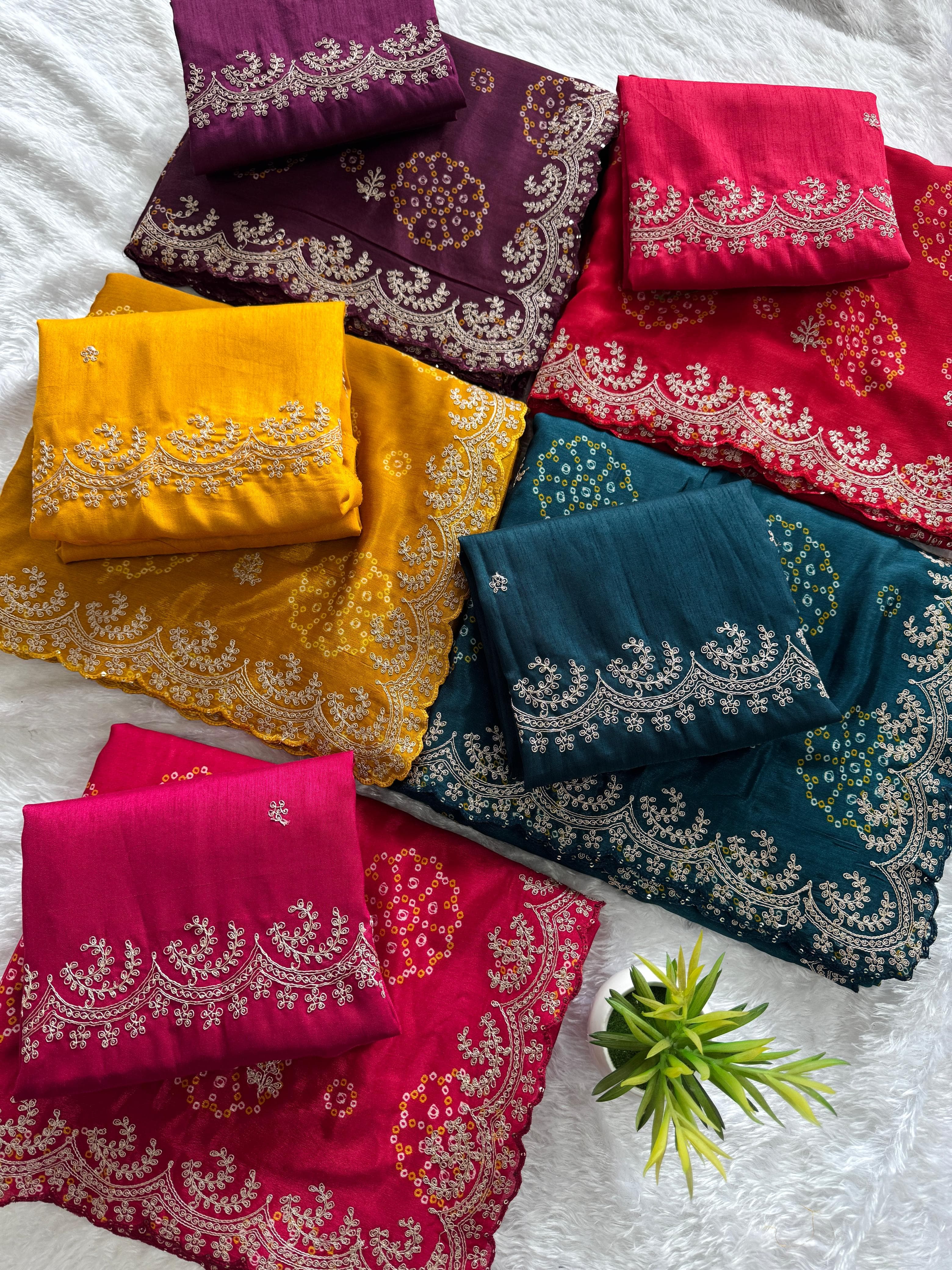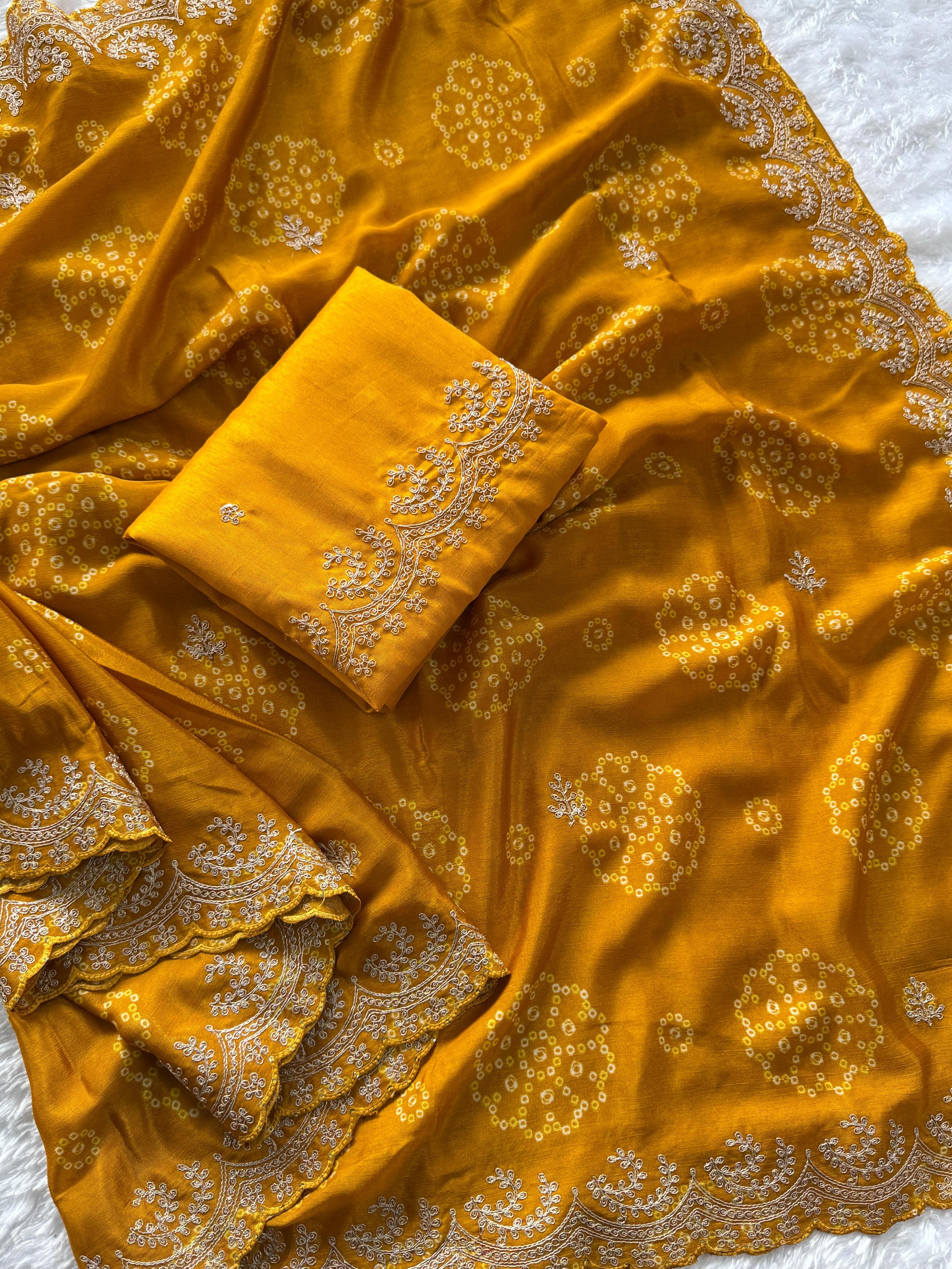 Looking for the perfect party wear saree that combines elegance and comfort? Our Mulmul Chinnon Sarees are just what you need. Made from high-quality Chinnon fabric, these sarees feature a gorgeous print design and heavy embroidery work. Complete with a silk blouse, these sarees are available in eye-catching colors like Blue, Red, Magenta, Yellow, and Purple. Get ready to turn heads at your next event!