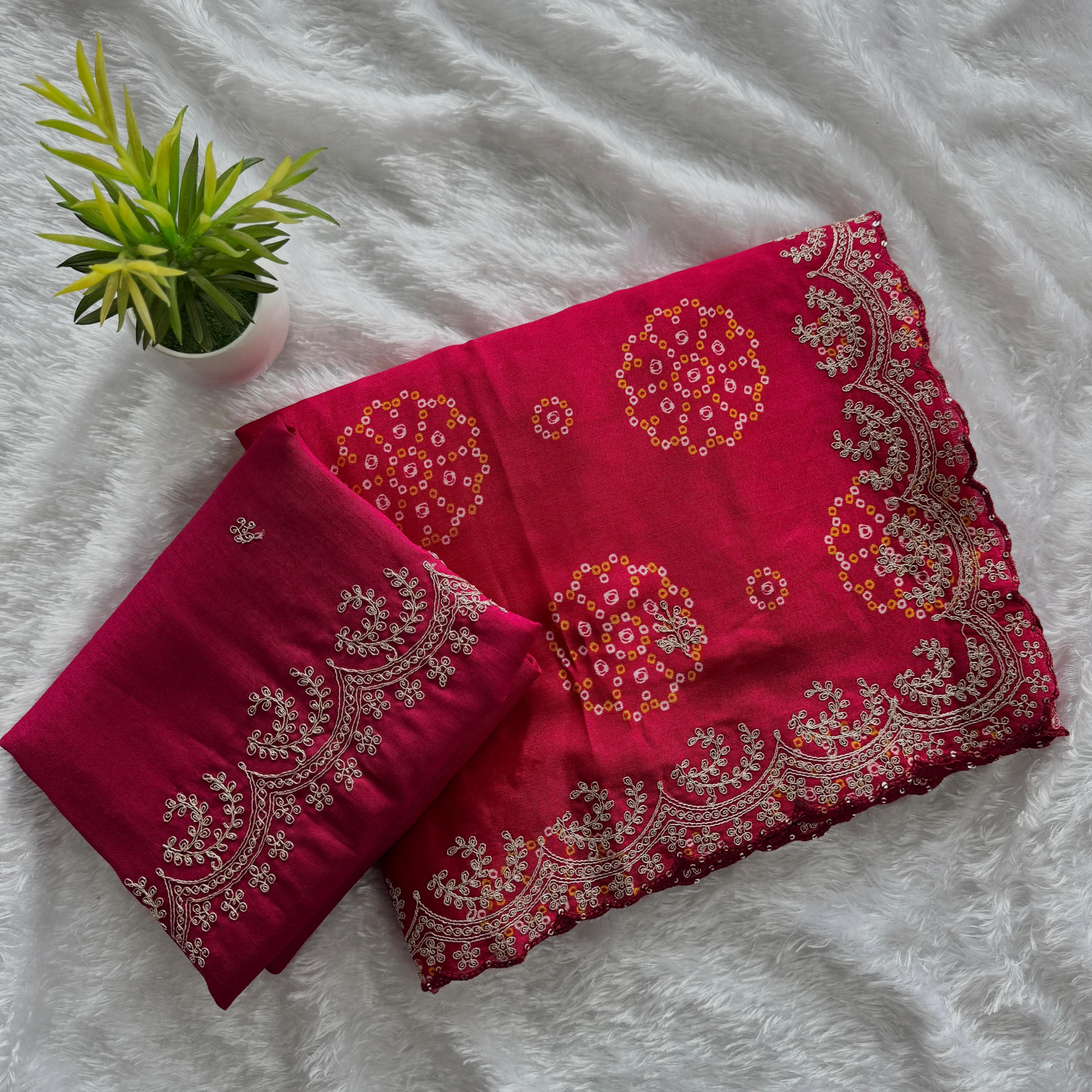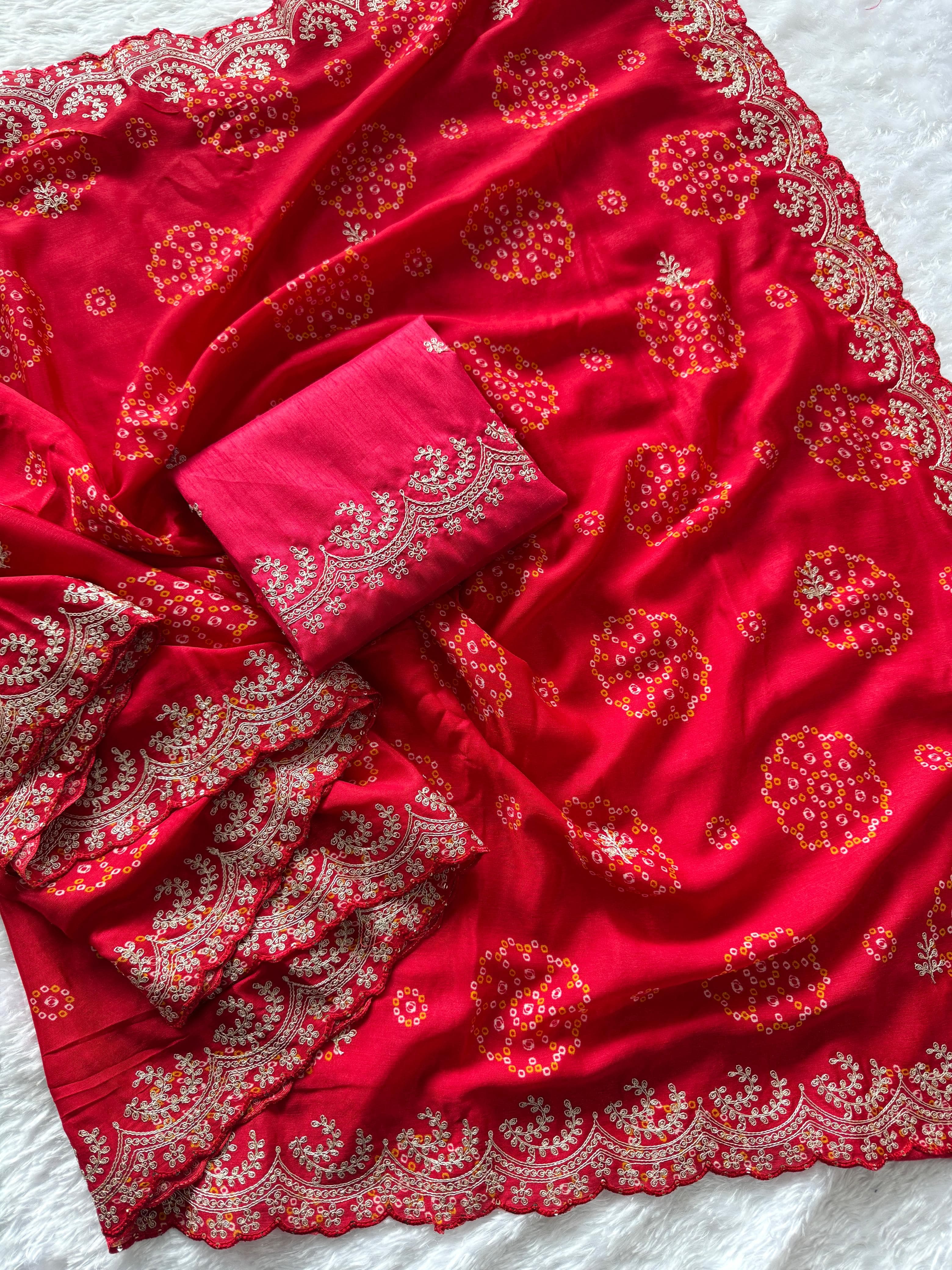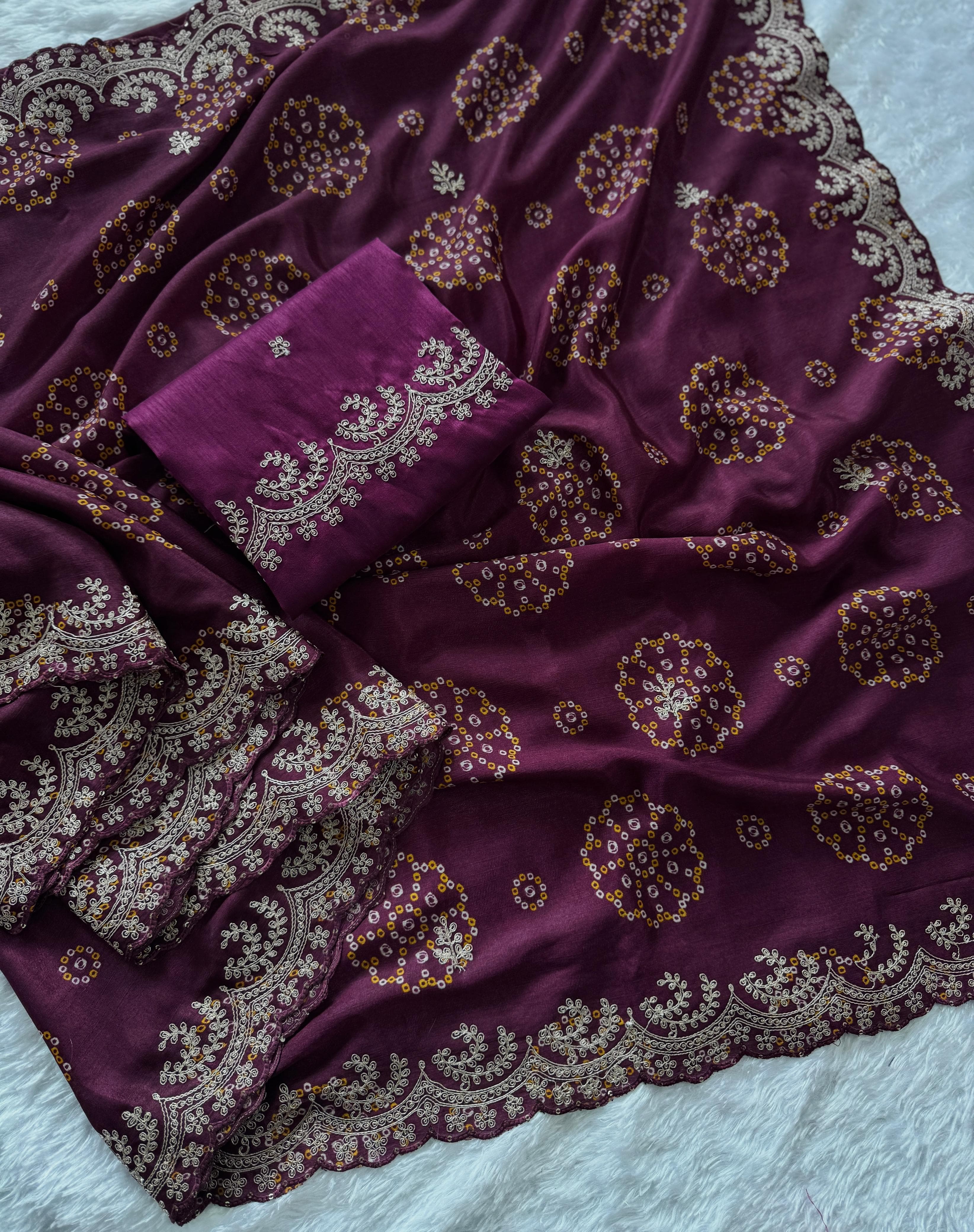 Mulmul Chinnon Saree With Beautiful Print Cover With Heavy Embroidery Work And Silk Blouse With Work.