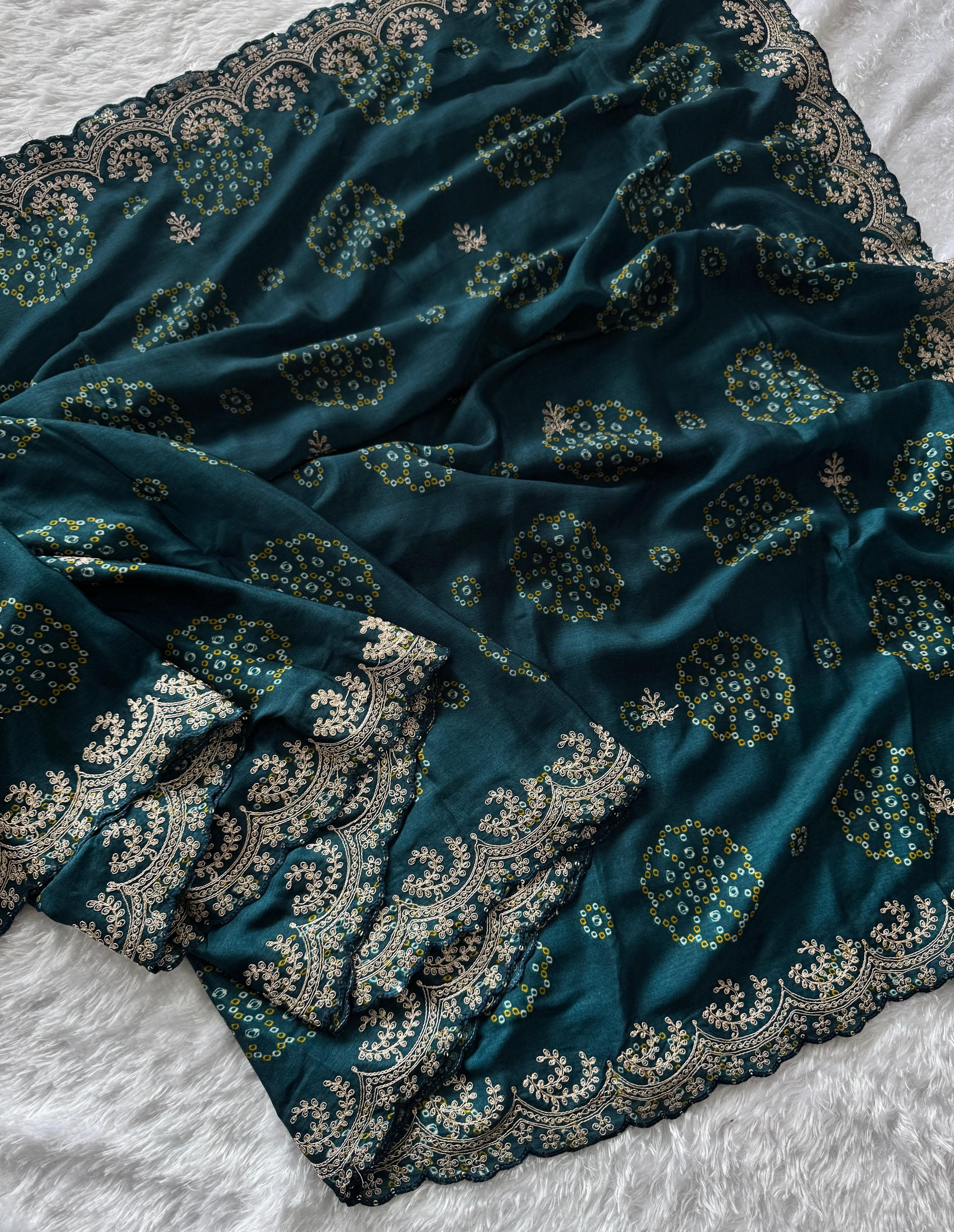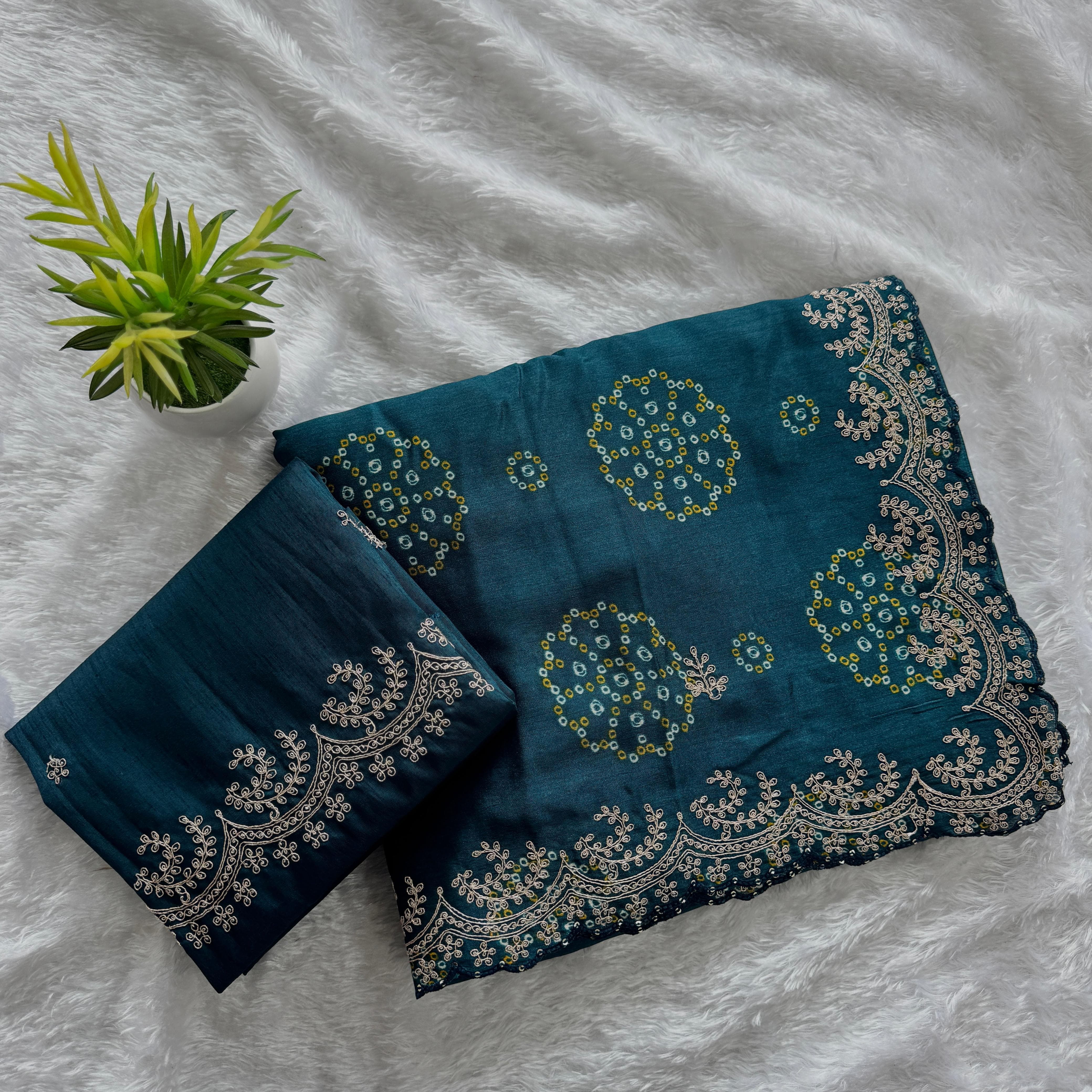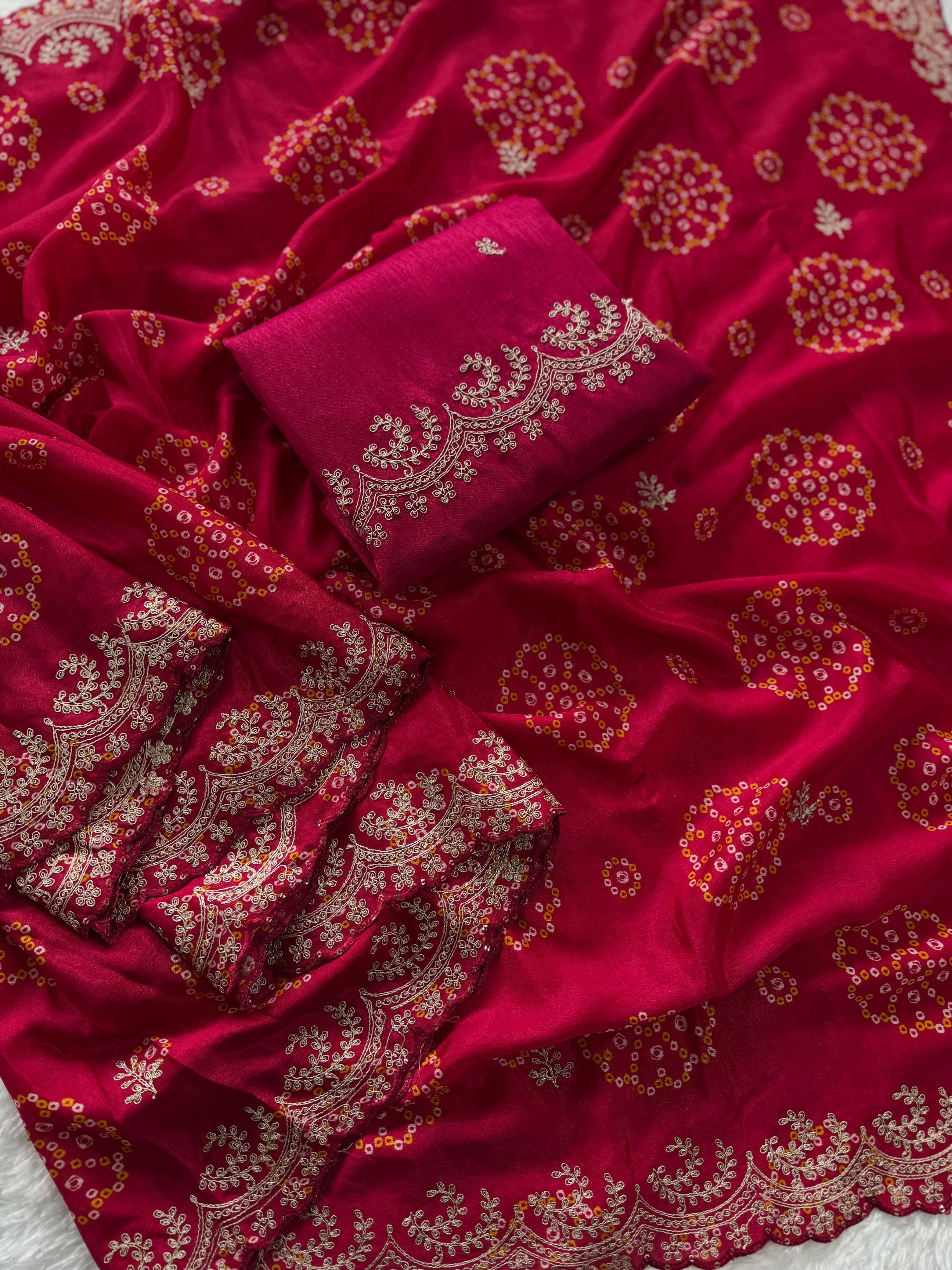 Mulmul Chinnon Saree With Beautiful Print Cover With Heavy Embroidery Work And Silk Blouse With Work.